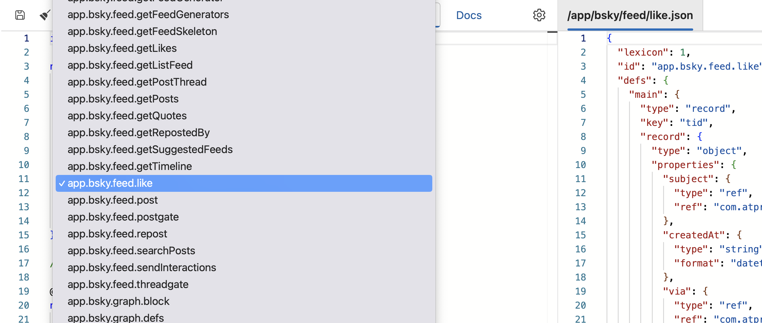 then in the playground, i wanted to have a few examples. and what better examples could i fill it with than the real lexicons from my tests? see https://playground.typelex.org/?sample=app.bsky.feed.like for example