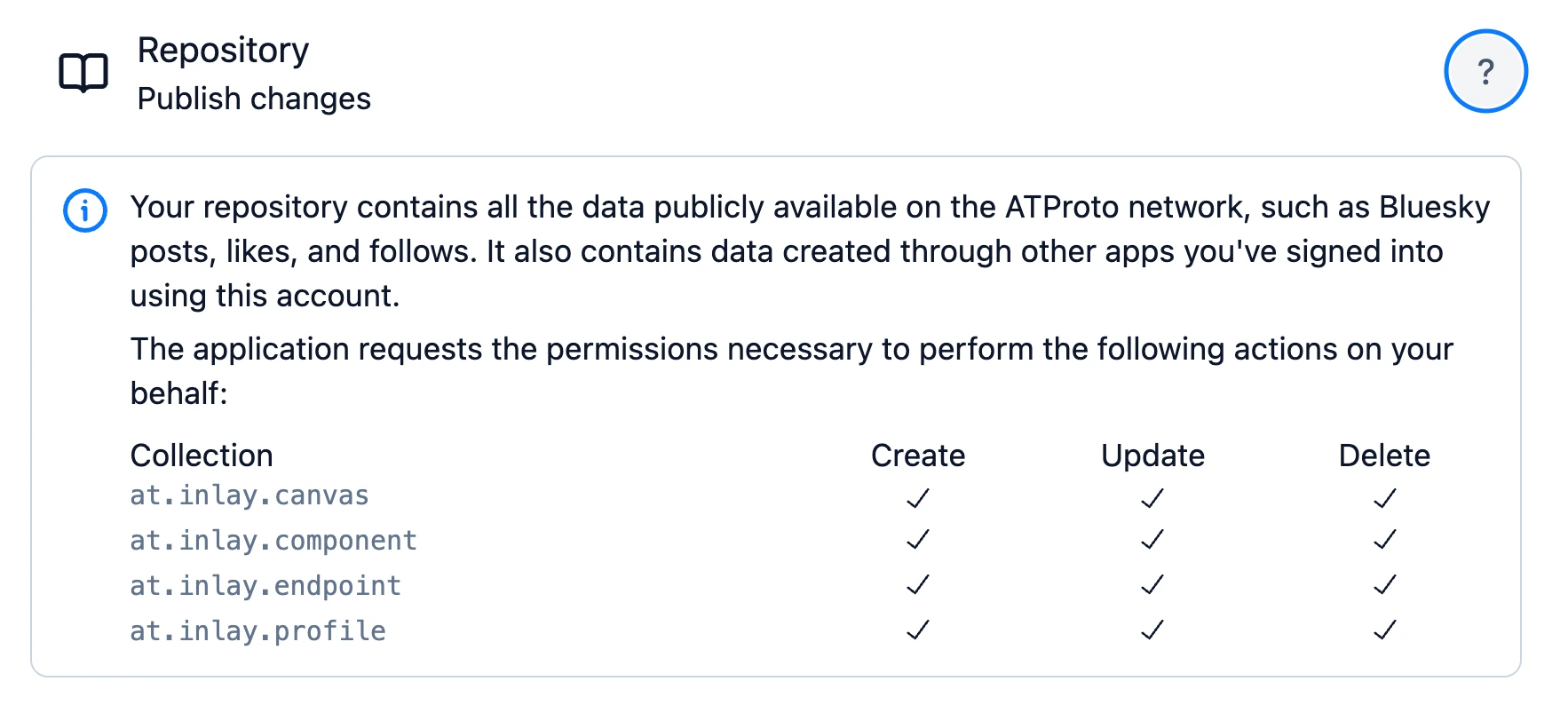 scope: "atproto repo:app.example.post?action=create&action=update repo:app.example.like",omitting ?action asks for full permissions (create, update, delete), i.e. the same as ?action=create&action=update&action=delete.